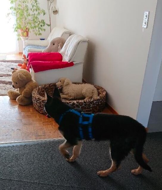 Am 2.5. war die erste Stunde des Junghundekurses. Corelli hatte Panik, bellte eine Stunde lang beinahe ununterbrochen, zog, wollte nur in die Büsche. Zu viel Bewegung um ihn herum, zu viele Einzäunungen, zu viele Menschen in der Nähe. Eine verständnisvolle Leiterin, geduldige Teilnehmer mit ihren Hunden, ermöglichten es, dass wir weiter machen konnten. Dann kam noch die Ankündigung, dass wir in der 10. Stunde eine Abschlussprüfung machen werden. Ich dachte in diesem Augenblick ‘dieser Hund kann das nie in der Zeit schaffen’. Was wir nacheinander während der Stunde ausprobierten: Leckerlis, an einer Tube lecken, um ihn zu beruhigen. Ihn umdrehen, zwischen den Beinen Schutz geben. Herumgehen, um ihn zu beruhigen. Leckerli am Boden suchen, weg von den anderen, etc., etc. Jede Aktion funktionierte nur kurze Zeit. Zuletzt brachte Wasser spritzen den Durchbruch. Aber auch, dass ich und die anderen es einfach aussassen. Ich übte dazu viel zuhause. Ich trainierte Doppelbefehle in Form von Hör- und Handzeichen. So machten wir in der 10. Stunde die Prüfung. Er machte es sehr gut, ich war stolz auf Corelli. Er war sogar ein Vorbild, weil man sah, was man mit einem absolut panisch ängstlichen Hund schaffen kann. Was ich wirklich gelernt habe: Corelli folgt mir besser, als ich je gedacht hätte. Corelli ist sehr sozial mit anderen Hunden und ist kein Schäferhund typischer Macho. Februar 2023 geht es weiter mit dem Erziehungskurs.
