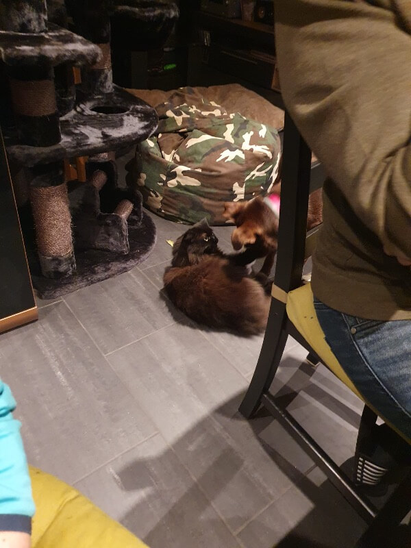 Mit unsere Nachbars Katze ist sie auch sehr gut befreundet sie spielen und kämpfen (spielend) und auch dort ist sie vorsichtig.
