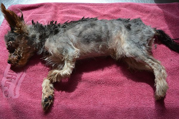 Dieser ca. 2 Jahre alte männliche Yorki wurde am 14.7.2016 in einem total verwahrlosten Zustand (jetzt geschoren worden, auf den Fotos in Narkose)und mit einem alten Bruch am Bein gefunden.
