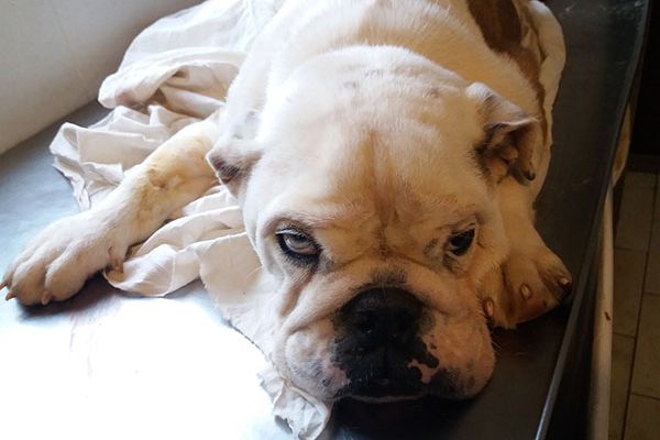 Diese junge Bulldogge mit einem Mastadarmvorfall wurde gestern ins Tierheim gebracht. Sie hat die OP gut überstanden und erholt sich nun auf der Krankenstation.