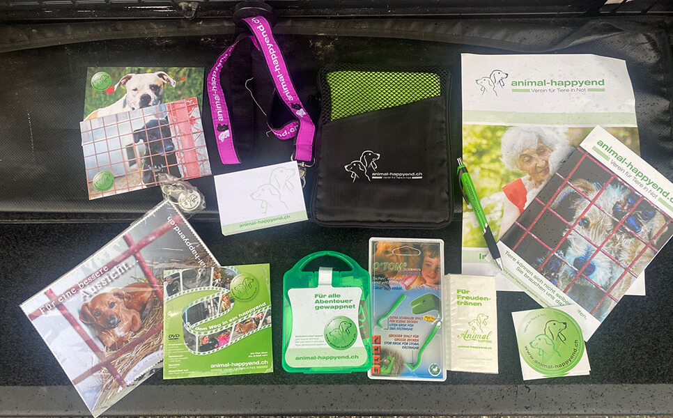 Postkarten, Brillenputztuch "für eine bessere Aussicht", DVD, Erste-Hilfe-Apotheke für den Hund, Zeckenentferner, Kugelschreiber, Schlüsselband, Einkaufs-Chip, Notiz-Post-It, Flyer und Legatbroschüre.